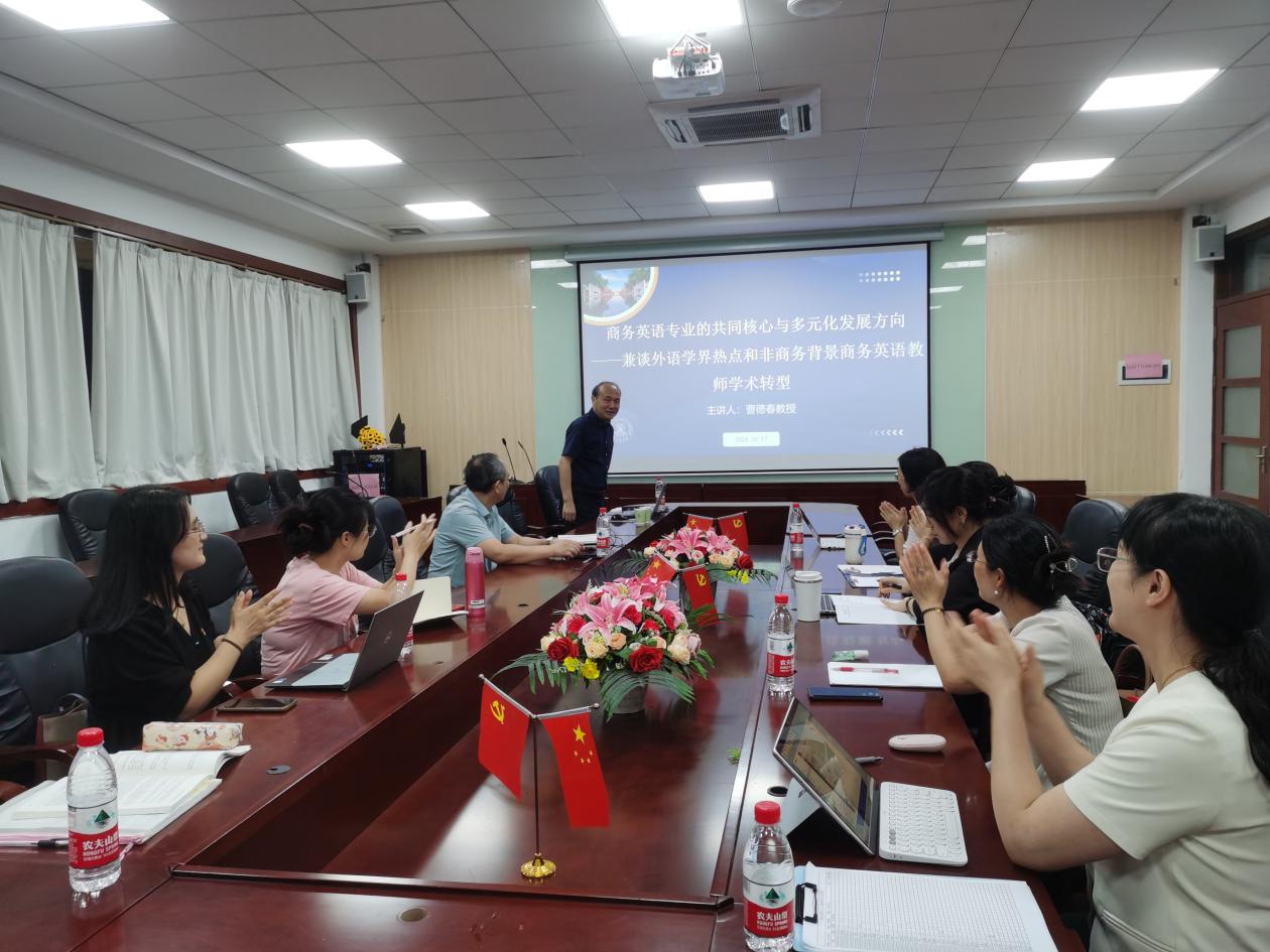 在全球化的浪潮中,商务英语作为连接国内外商务沟通的桥梁,其重要性日益凸显。为了进一步深化商务英语专业的学术研究和教学实践,10月17日下午,曹德春博士受邀来到伟德国际1946为商务英语系的老师们带来了一场主题为“商务英语专业的共同核心与多元化发展方向——兼谈外语学界热点和非商务背景商英教师学术转型”的精彩讲座。