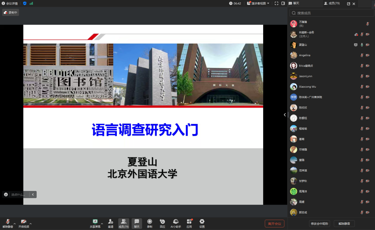 夏登山教授从历史比较语言学的宏观视角切入,追溯了语言学的发展历程,着重介绍了历史比较法的研究路径,即通过全球范围内的实地探访,探寻语言间在语音、词汇、句法等方面的历史关联,生动诠释了语言研究的真谛。随后,他系统讲解了语言调查的主旨与基本策略,涵盖了质性研究与量化研究的融合、快速匿名调查法等实用技巧及其应用场景。