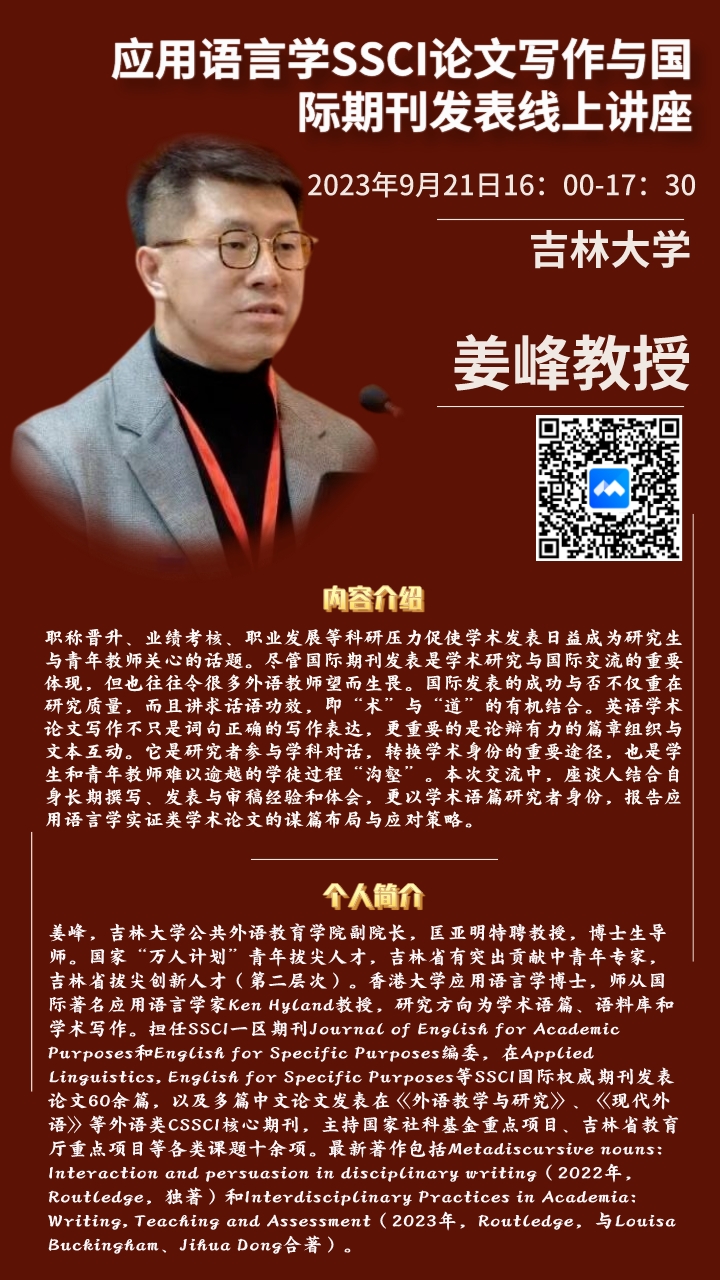 姜峰讲解方式富有启发性,为听众提供了具体可行的建议,帮助他们更加清晰地理解了学术研究和国际发表的精髓。他也鼓励在座的所有研究生和青年教师,要积极地参与国际学术交流,勇于面对和克服学术写作过程中可能遇到的各种挑战和困难。此次讲座无疑加深了参与者对于应用语言学学术研究和论文写作的理解,丰富了他们的学术视野。通过姜峰的独到见解和实用建议,相信所有追求学术卓越的学者都能在国际学术舞台上取得更为亮眼的成绩。