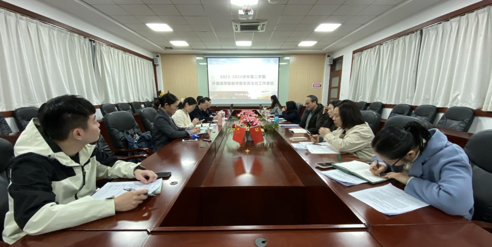 书记徐超和教学副经理袁鑫对老师们的汇报进行点评。徐超提出“六个加强”的指导意见,其中包括师德师风建设、学科竞赛活动、考级考证工作、科研工作、团队队伍建设、就业信息等方面内容,其中重点突出老师们应加大对教学质量的投入。袁鑫着重强调系部主任应提升管理工作站位,从更长远的发展角度全面规划各系的工作。他将教学管理工作分为常规工作和重点工作,指出每个层面本学期有哪些任务需要完成。另外,秉持“工作服务于未来”的目标,系专业应该针对外语教学中的“问题”和专业发展的“危机”,谋划工作内容,做到“心中有人培、手中有项目、眼中有团队”。