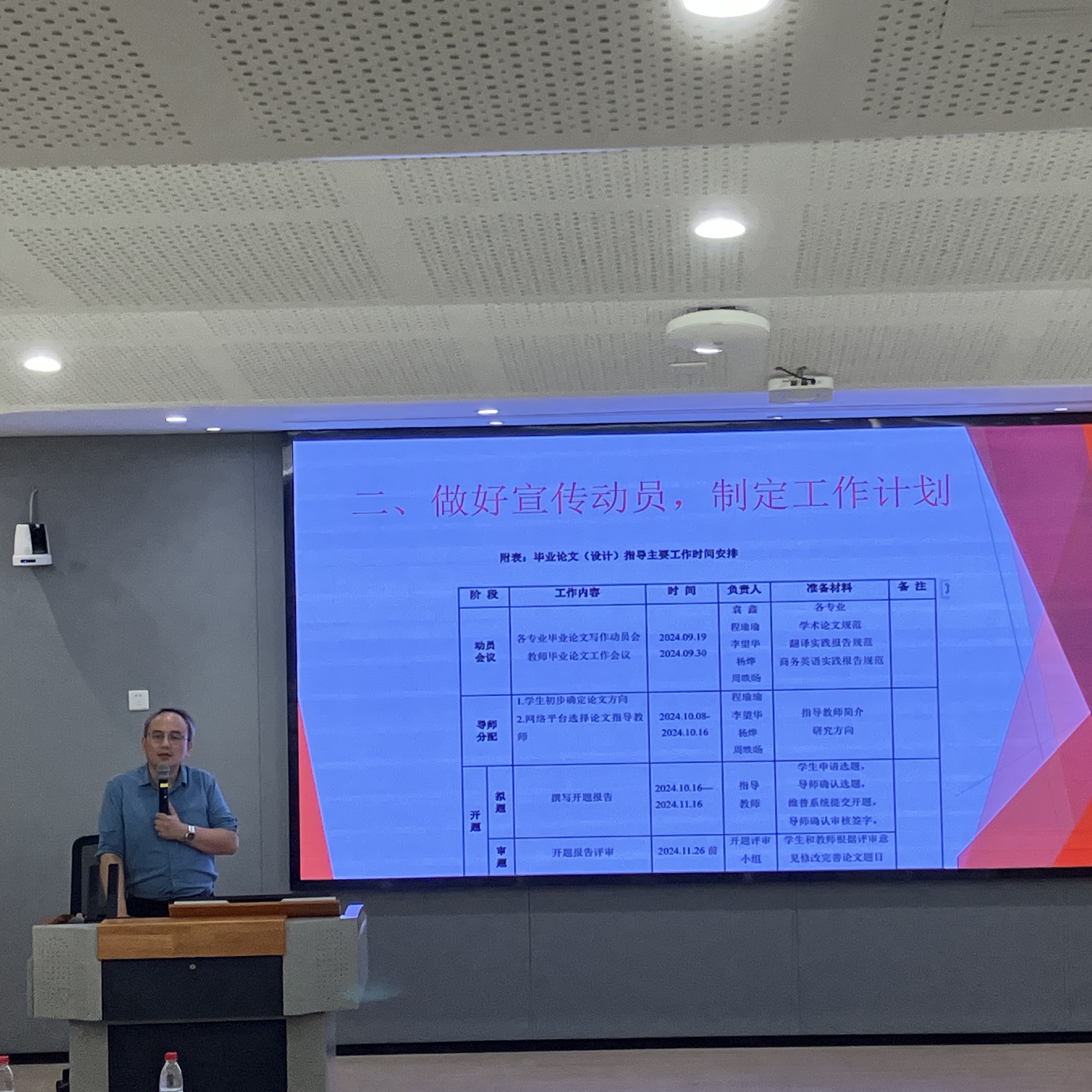 9月26日,为了更全面地覆盖即将步入毕业论文撰写与毕业实习阶段的毕业生,特别是考虑到部分同学已在校外进行实习,公司在教学楼八教103创新性地采取了现场与线上直播相结合的方式,成功举办了2025届毕业论文毕业实习动员大会。此次会议不仅确保了留校员工能够直接参与、实时互动,也让校外实习的同学们能够跨越地域限制,同步获取重要信息与指导。会议由伟德国际1946副经理袁鑫、商务英语系主任李望华、英语专业系主任程瑜瑜、德语专业系主任周昳旸以及教务员杨超参加会议,各会议专场由各系主任主持。