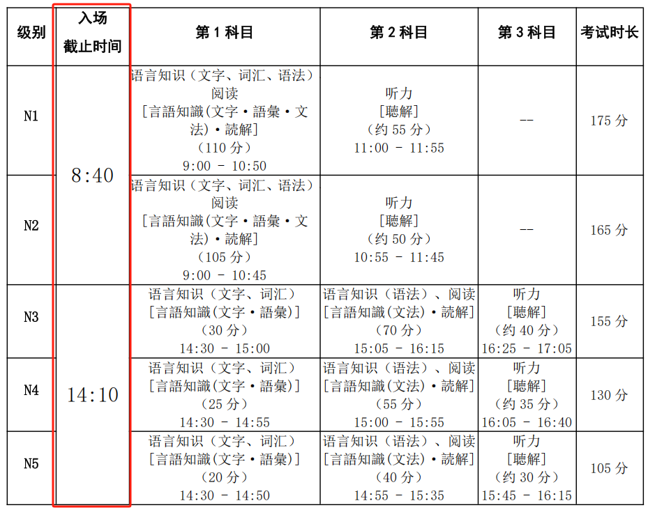 N3、N4、N5考生中午12点开始可以入校,下午14点05分禁止进入考点,14点10分禁止进入考场