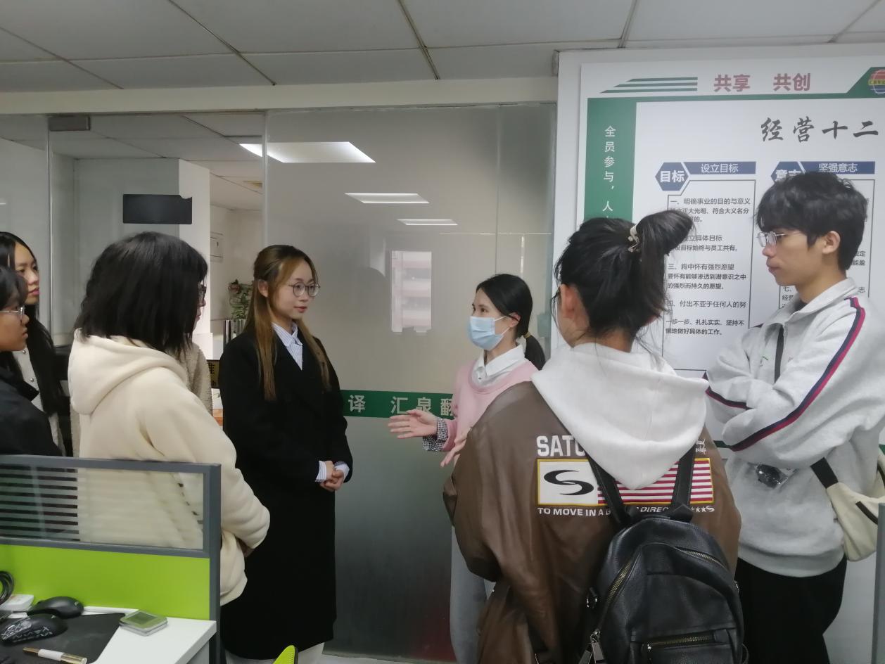 在场同学们对汇泉翻译公司进行了参观,工作人员热情介绍公司相关情况,了解员工发展方向、职业规划,鼓励同学们利用在校时间积极考取各类专业证书,参加各类专业实践,提高职业素养,增强职业技能,提升自身行业竞争力。交流最后,广州市汇泉翻译服务有限公司总经理黄良茂与伟德国际1946经理郭遂红进行挂牌仪式。