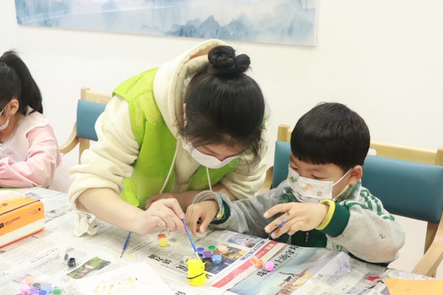 志愿者们认真仔细地布置好教学用具,对课堂桌椅进行合理的摆放,并且给各位小朋友准备陶瓷小熊、画笔、颜料等,以保证他们的课堂参与率和互动率。小朋友们与志愿者老师积极互动,点燃了热情有趣的课堂氛围。短短的志愿服务时间里,志愿者们和小朋友们携手合作,绘画出带有独特记忆的小熊。
