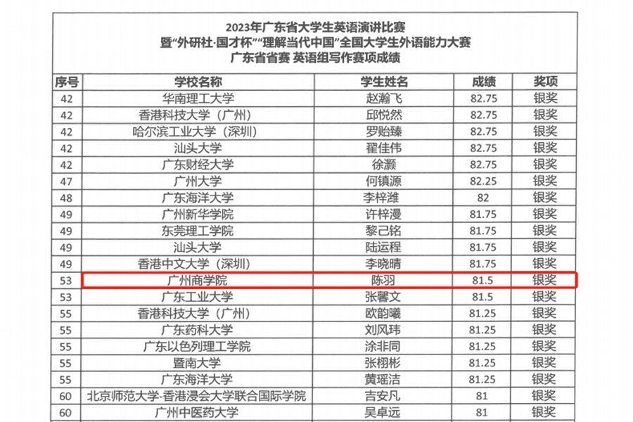 陈羽荣获英语写作大赛广东省赛区银奖