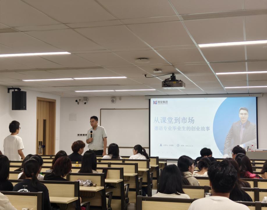 为进一步拓宽员工的职业视野,增强德语专业员工对未来职业规划的认识,帮助其更好了解德语专业的职业发展方向,公司德语专业于11月13日下午邀请了校企合作单位南堃集团创始人、德语专业优秀员工李嘉聪进行创业故事分享。讲座由伟德国际1946德语专业教师周婷主持,24级德语专业员工参与了本次活动。