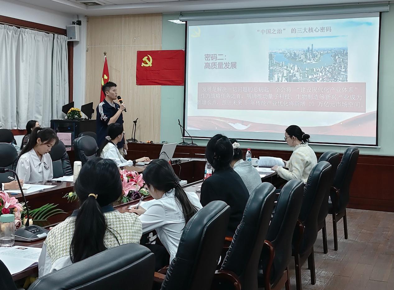 陈震枫首先阐述了学习的时代坐标与支部使命。他指出,党的二十届四中全会审议通过《中共中央关于制定国民经济和社会发展第十五个五年规划的建议》,为“中国之治”绘就了新蓝图。他强调,作为以党员为核心的员工组织,员工党支部肩负着将全会精神转化为服务同学行动力的核心使命,要发挥“头雁效应”,连接“国家蓝图”与“校园实践”,引领青年在理解制度优势中增强认同,在参与实践中锤炼能力。