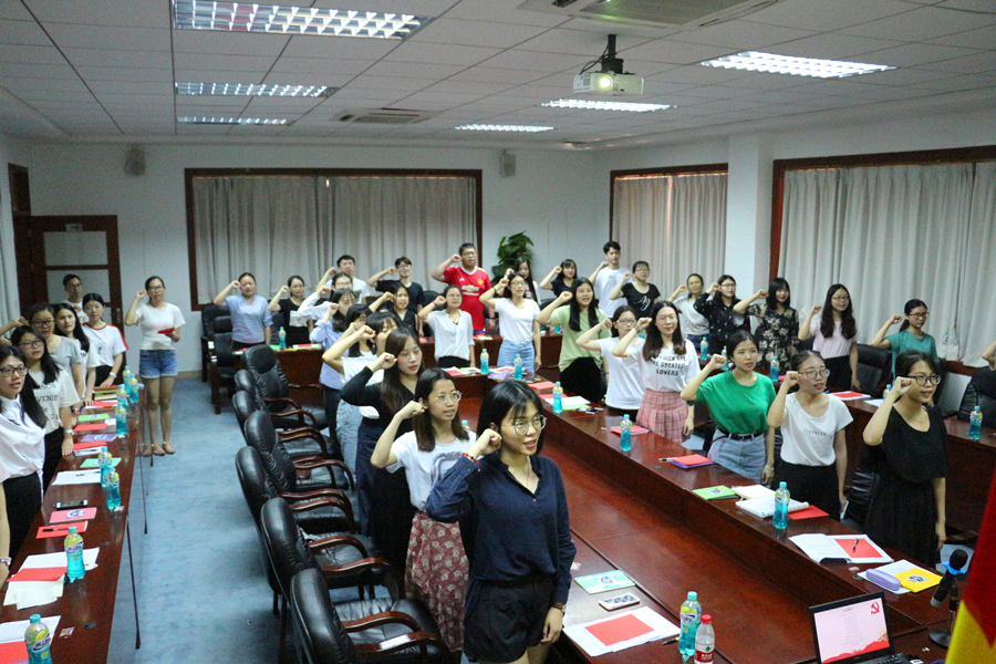 紧接着,徐超带领全体毕业生党员重温了入党誓词。在仪式上,全体毕业生党员面对鲜红的党旗,庄严地举起右手,郑重宣誓,表达了全体党员为党的事业奋斗终身的决心和愿望。宣誓完毕后,全体毕业生党员写下寄予外院的话语,并畅谈自己四年的青春和心得体会。最后在“党在我心中”——我和党旗合影环节中,党员们紧靠一起,镜头定格,与党旗亲密合影,表达对党美好的祝福。