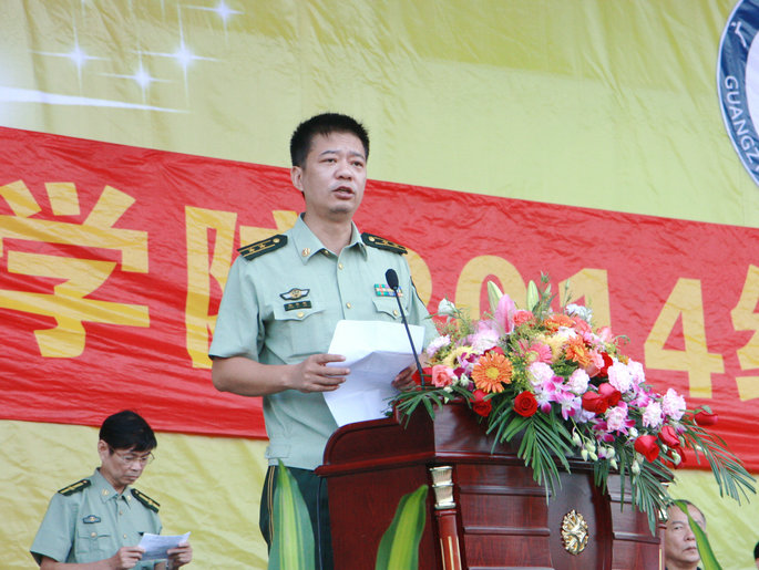 新生代表会计系乔晨同学代表2014级参训同学宣誓,表明全体参训同学将刻苦训练、严守纪律、听从指挥、服从命令、磨练意志、不怕困难、尊敬老师、尊重教官,争做优秀学员,为班级增光,为广商添彩。