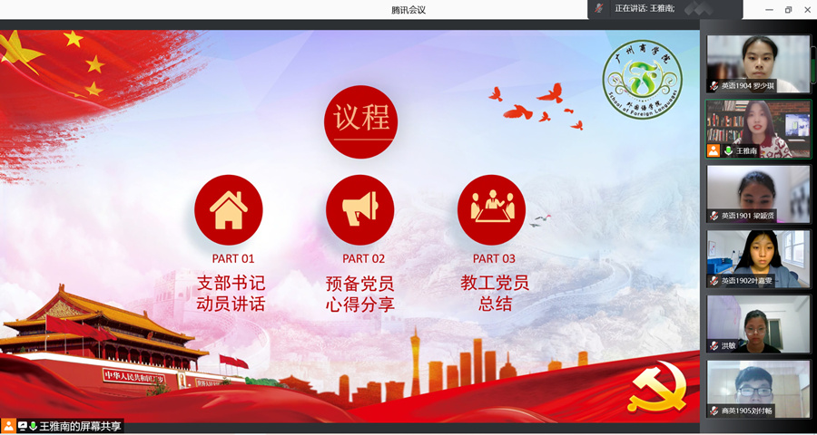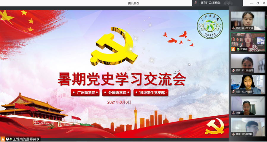 为深入学习贯彻习近平总书记在庆祝中国共产党成立100周年大会上的重要讲话精神,进一步从党的百年伟大奋斗历程中汲取继续前进的智慧和力量,教育引导全体党员学党史、悟思想、办实事、开新局,进一步学懂弄通做实习近平新时代中国特色社会主义思想,不断增强“四个意识”、坚定“四个自信”、做到“两个维护”,8月6日晚7点,伟德国际194619级员工党支部在腾讯会议开展暑期党史学习教育交流会。会议由王雅南主持,19级员工党支部全体党员出席。