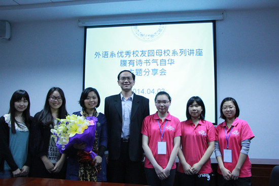 在公司喜迎十五周年校庆之际,4月3日下午16:10,外语系特邀2007届英语专业优秀员工、现任珠海市第九中学副董事长邓媛媛回母校开展主题为“腹有诗书气自华,女儿当自强”主题分享会。本次主题分享会在第二行政楼308举行,外语系党总支书记徐超、系办公室主任贾琼、系员工会指导老师黄玉亭等参加了本次主题分享会,外语系及兄弟系的师生的积极参与本次活动。