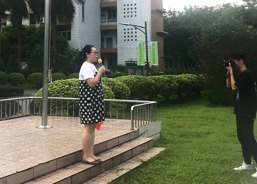 7点整,国旗护卫队着装整齐、步伐矫健,护卫着鲜艳的五星红旗入场。伴随着《义勇军进行曲》,国旗冉冉升起,全体师生庄严肃立,高唱国歌,向国旗行注目礼。五星红旗在空中飘扬,人群中响起熟悉的旋律,16级员工党员代表陈小婉,员工代表欧嘉洳等6名同学随着熟悉的旋律,从员工队列中缓缓走出,唱起了《我和我的祖国》。唱出了“我亲爱的祖国,我永远紧贴着你的心窝”温馨和深情,校园里响起了这一刻骨铭心的旋律,手中鲜艳的小红旗,随着旋律摆动着,映着葱郁的绿草,形成了一道亮丽的风景线。最后,黄玉亭发言:她强调升旗仪式是培养新时代爱国主义情怀的绝佳时机,希望新时代外院青年要热爱伟大祖国,在有限的大学时光勇于砥砺奋斗,练就过硬本领,担当时代责任。