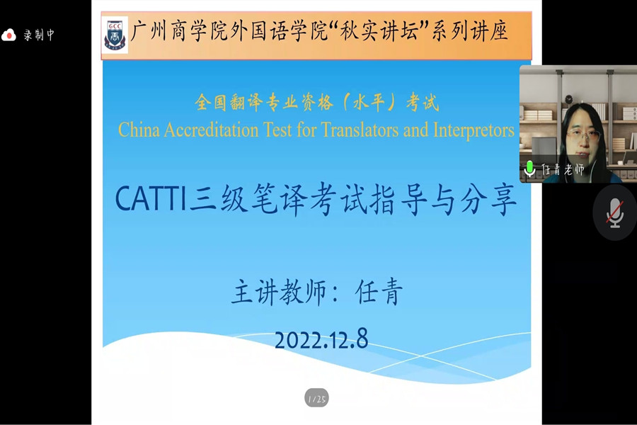 为进一步服务公司学子考级考证,开展“我为群众办实事”实践活动,公司教工第一党支部联合院员工会于12月8日下午,通过腾讯平台开展2022年“秋实讲坛”系列讲座之CATTI三级笔译分享交流会。本次交流会由公司商务英语系“双师双能型”教师任青和公司第一党支部组织委员、商务英语系专任教师张珊主讲,教工第一党支部书记何瑞玉、教工第一党支部宣传委员朱渺以及公司200多名员工积极参与到此次讲座中。