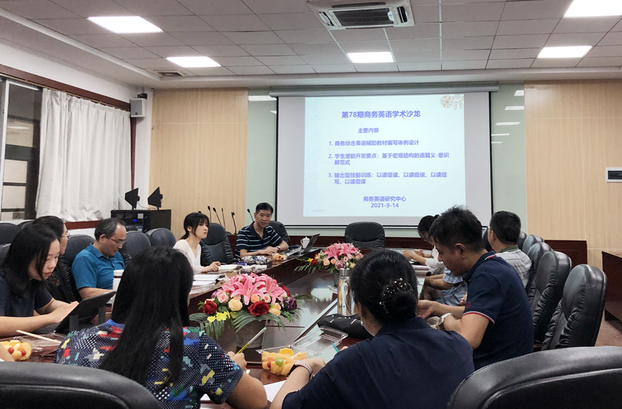 公司“商务英语学术沙龙”第78期活动于15日15:50在第二行政楼308会议室举行。专业负责人曾利沙教授针对现有“综合商务英语”教材和教学实践中存在的若干问题,基于“体验-建构融通式”教学模式,提出编写辅助教材的系统性方法和示范性体例。商务英语专业全体教师及部分英语专业教师参加了本次沙龙。