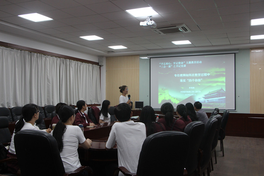 11月7日11点,公司教工第一党支部“不忘初心、牢记使命”主题教育“三会一课”之“书记党课”在第二行政楼308进行,该党课以“专任教师如何在教学工作中落实‘四个自信’”为主题,由党支部书记李海燕主讲,公司党总支书记徐超莅临指导,13名党员听取了这场讲座,并进行了积极地讨论。