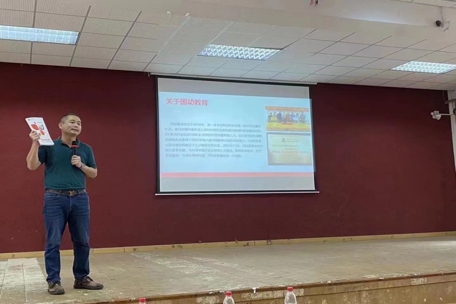国幼教育科技董事长黄德生对早幼托育行业的背景、发展等方面进行详细解读,让同学们对行业有了深入的了解,并同时以PPT的形式向员工们介绍了该企业的基本简介、成长历程、企业布局以及业务范围,从全方面、多层次展现了该企业所具备的就业优势和未来发展规划。此外,黄德生以视频的形式向同学们展示目前国内对于早幼托育行业的政策与扶持,进一步展现了该行业发展潜力。黄德生表示,三百六十行,行行出状元,希望同学们在对未来的职业生涯规划中能有一个明确的方向,用自己的所学所得去为自己的未来不断努力奋斗。