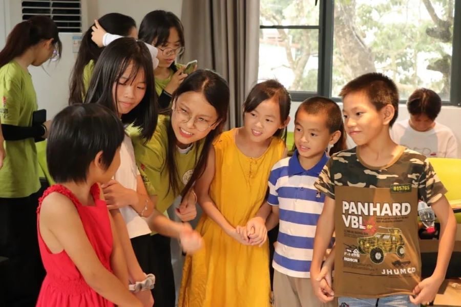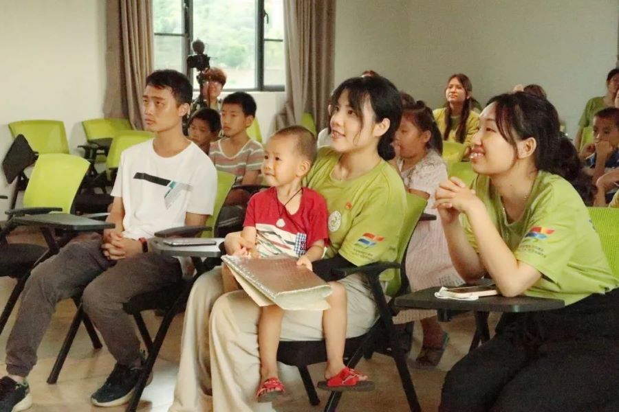 阳光展翅实践团全体工作人员依次上台进行自我介绍并与小朋友进行互动,支教组成员对接下来各项教学工作进行了简短的说明。本次支教课程内容丰富,包含太极、英语、音乐以及手工等多门课程,旨在丰富小朋友们的暑假生活、开拓视野,在玩乐中学习,激发大家的学习兴趣。随后,主持人通过抽签的方式将小朋友们与阳光展翅团成员开展击鼓传花、你来比划我来猜等互动游戏。