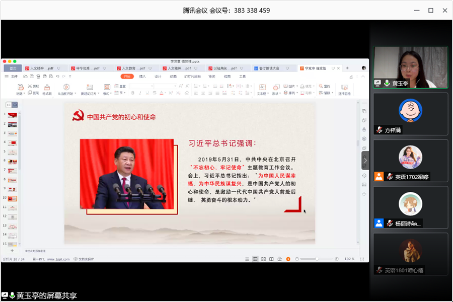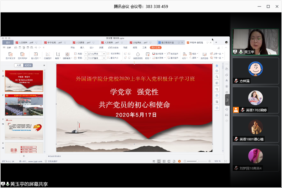 梁婷向大家介绍了此次党课的学习主题和培养目标并向大家重申了党课学习的学习纪律和考勤办法。黄玉亭以启蒙初心、滋养初心、践行初心为思路讲解了入党发展五个阶段的流程、介绍了《中国共产党章程》的总纲、指导思想、党员的义务和权力、入党誓词。她强调,党章是党的宗旨和行为规范,作为一名入党积极分子,要读通弄懂做实新时代党章的新内容新要求,要忠实履行党员义务、要严格践行党员权利、要深刻理解入党誓词。最后,黄玉亭希望各位学员在发展的过程中,要积极走在前列,练好“脚力”,增强“眼力”,强化“脑力”,提升“笔力”,争取早日成为一名合格的共产党员。课上,通过讨论区,师生积极互动,课堂气氛十分活跃。