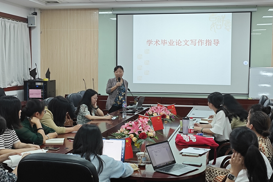 戴桂玉教授就英语专业毕业生论文选题和开题报告的撰写做了详细讲解,主要内容包括:论文选题的基本要求(明确理论视角和研究对象、确定研究焦点、紧跟国家重大战略规划和研究前沿、树立创新意识)和研究计划书的撰写细则(主要包括研究背景、研究目的与研究问题、研究意义、文献综述、研究方法等部分)。戴桂玉教授以自己指导过的员工毕业论文为案例,具体分析论文写作中的关键环节和注意事项,为与会教师提供了明确的论文指导方向。她总结道,毕业论文一定要体现问题意识,论文各个环节之间必须逻辑严谨、环环相扣,论证充分。