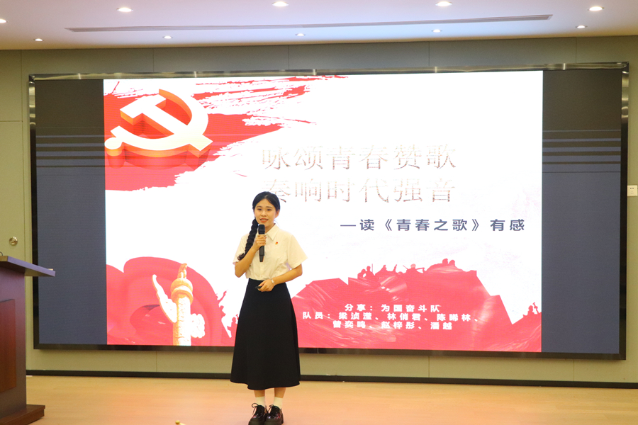 员工第一党支部林俏君代表“为国奋斗队”通过探作品之核、揭人物之奥、彰经典之韵、悟青春之歌四个方面做红色经典书籍《青春之歌》的读书分享,带领学员们于青春之歌中悟青春之道。“打倒反动的国民党!”“中国共产党万岁!”“共产主义是不可战胜的!”这高亢激昂的呼声振聋发聩,展现着青春气象,传达着热血精神,呼吁在场学员唱响青春乐章,共谱时代强音。
