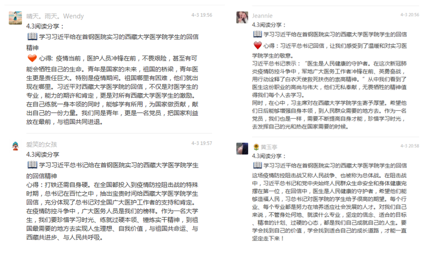 快乐阅读打卡活动为了激励同学们利用在家时间阅读交流,拓宽学术视野、滋养精神境界。全体党员线下开展自学阅读,读经典、读战“疫”故事、读成长感悟;每天在党支部微信群准时打卡,分享经典美文、诉说读书感悟、推荐好书读物。此外,党支部也在“快乐阅读打卡”活动中积极参与学习习近平总书记给在首钢医院实习的西藏大学医公司员工的重要回信精神,分享学习感悟。党员同志缪雅琪认为:疫情期间,“宅在家里做贡献”是每个中国人为战胜病毒必做的事情,这样我们也拥有了大把空余时间,静下心来,每天挑选一个最适合自己的时间点读书,用打卡让“他律”激发“自律”。这个假期也是收获满满。
