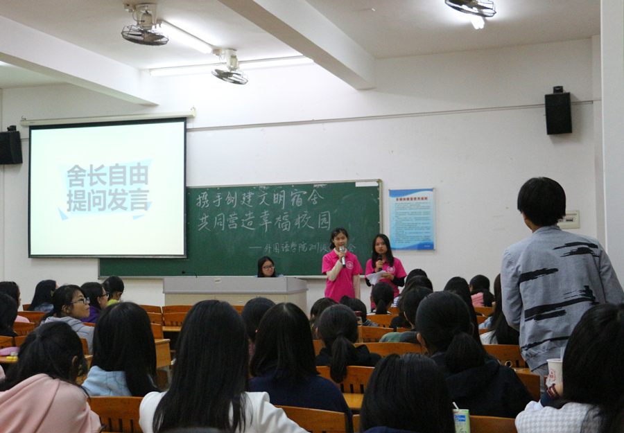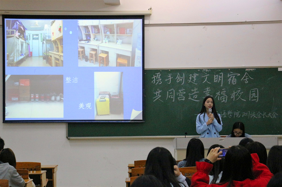 在大会上,生活部的干部首先向17级的各位舍长介绍了宿舍管理制度和公寓管理工作评优制度,此外还详细说明了公司评选“星级宿舍”、“优秀学风宿舍”、“文明宿舍”和“优秀舍长”的标准,让各位新生舍长更加明确了各项细则,提升了同学们为营造良好的宿舍氛围的信心。随后,16级优秀舍长代表李翠柳分享了一年半以来与舍友共同生活的点点滴滴,其中包含了宿舍内部的建设、管理方法等内容,通过舍友的共同努力,该宿舍获得了公司“星级宿舍”、“优秀学风宿舍”等荣誉称号。活动的最后环节,很多新生舍长也就目前各自构建文明宿舍过程中遇到的烦恼和困扰进行了提问,在场的老师和干部也为他们进行了很好地解答。