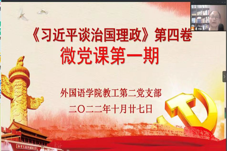 10月27日晚,为深入学习宣传贯彻《习近平谈治国理政》第四卷,伟德国际1946教工第二党支部线上微党课活动正式开课。活动本着“支委带头,全员参与”的原则,旨在通过让每一位党员讲党课,引导全体党员准确把握《习近平谈治国理政》第四卷的核心要义、精神实质、丰富内涵和实践要求。本次微党课活动共四期,每一期由四至五名党员宣讲,每名党员宣讲一至两个专题。第一期由本届和上届支委会成员唐海民、范俊英、姚丽芳、潘文晗等老师主讲。