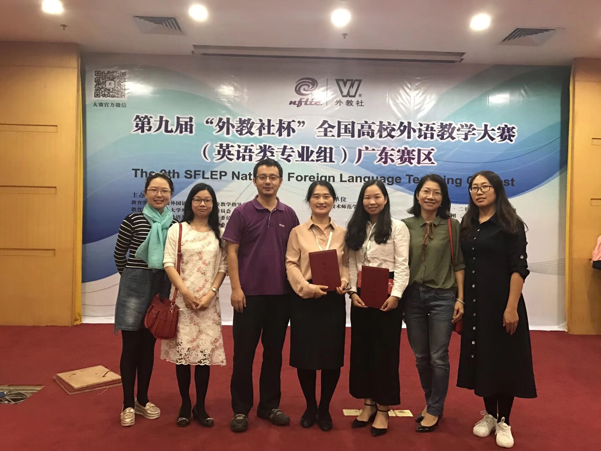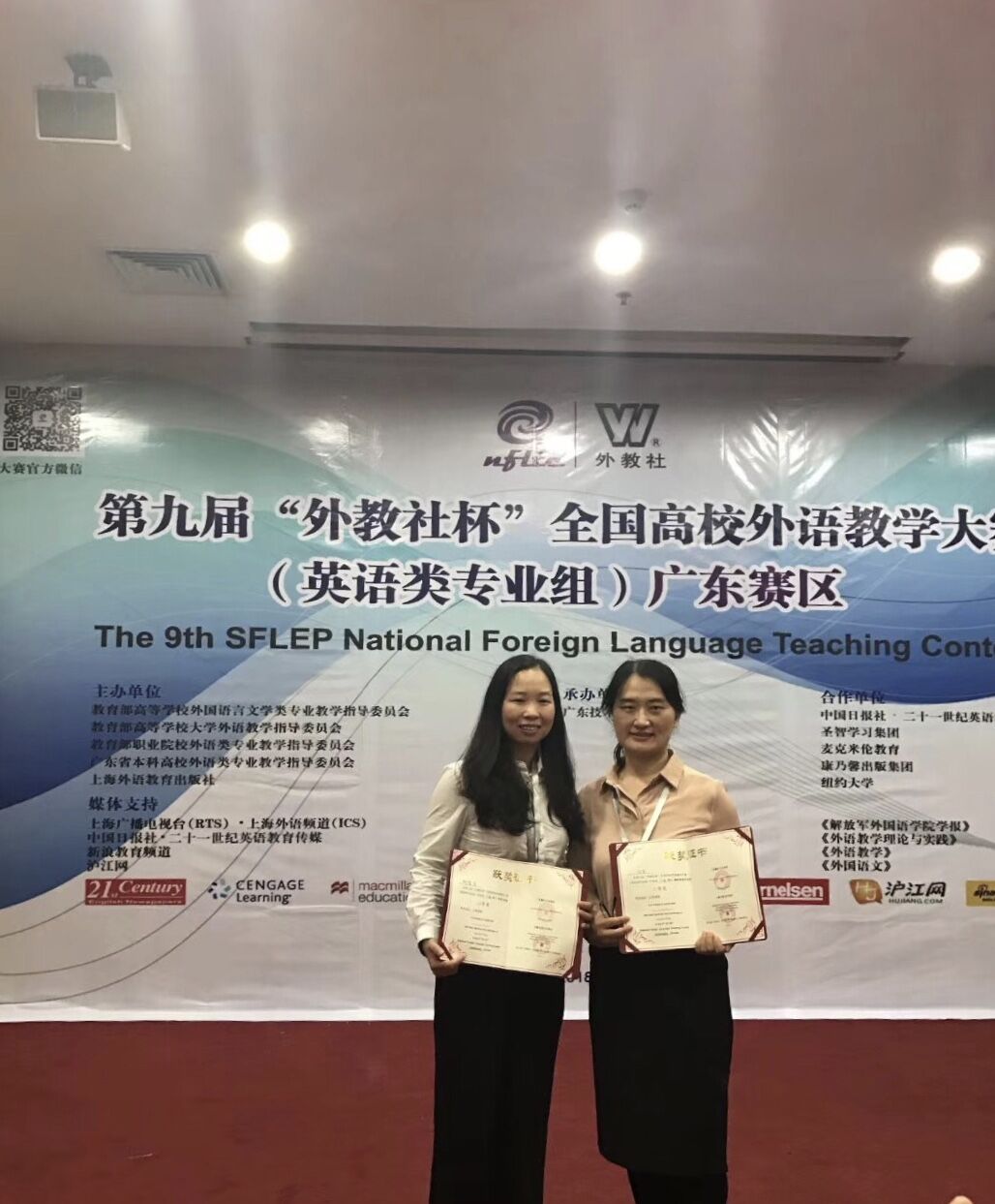 2018年10月27日,由教育部高等公司外国语言文学类专业教学指导委员会、教育部高等公司大学外语教学指导委员会、教育部职业院校外语类专业教学指导委员会、广东省本科高校外语类专业教学指导委员会和上海外语教育出版社联合主办的“广东省2018年本科高校外语教学大赛”暨“第九届‘外教社杯’全国高校外语教学大赛(广东赛区)”决赛在广东技术师范大学举行。公司的邵春发老师和任青老师经过复赛的激烈角逐,顺利进入各专业组的前十名,从而进入决赛,并以优异的表现最终分别获得了“英语专业组”和“商务英语专业组”的二等奖。