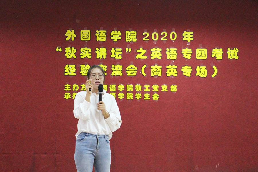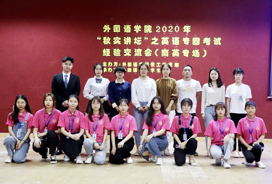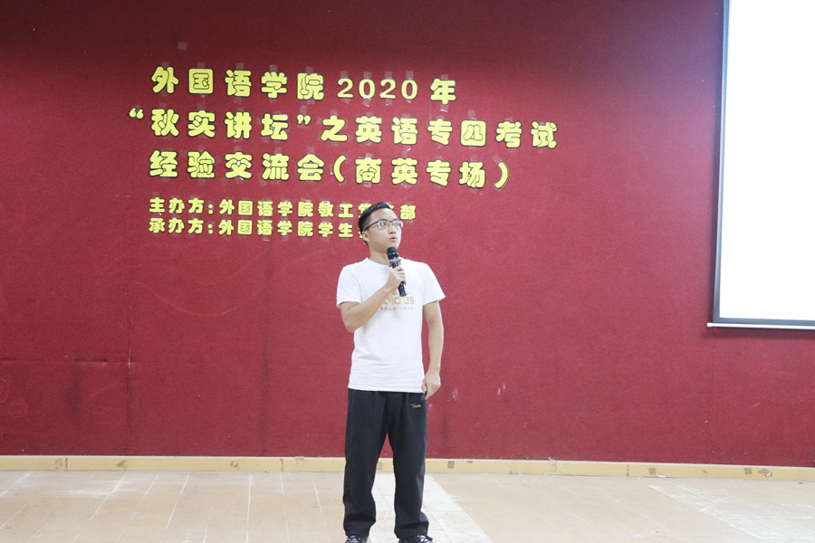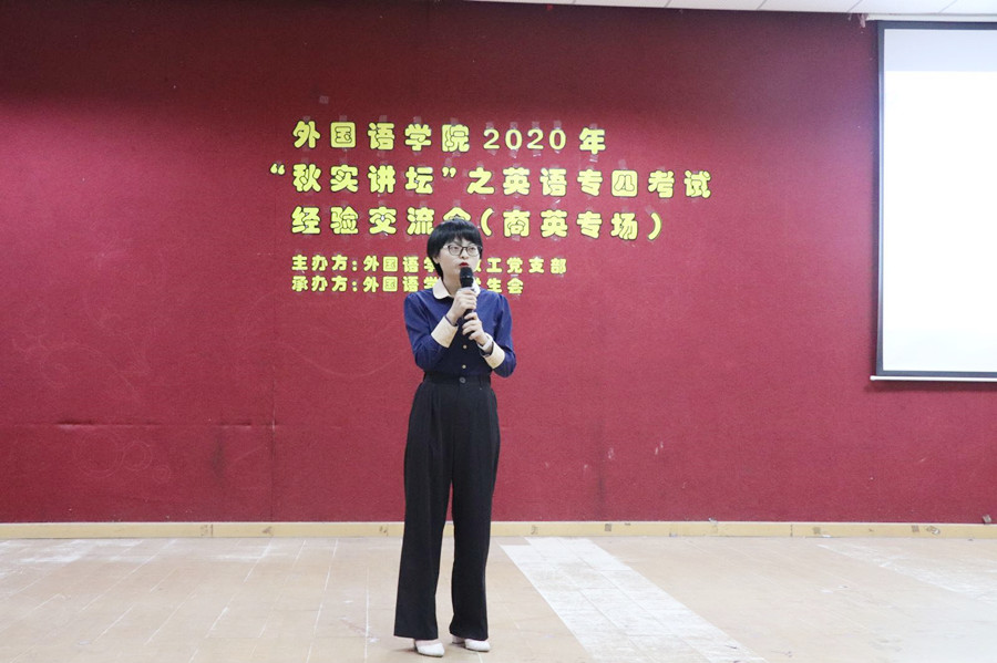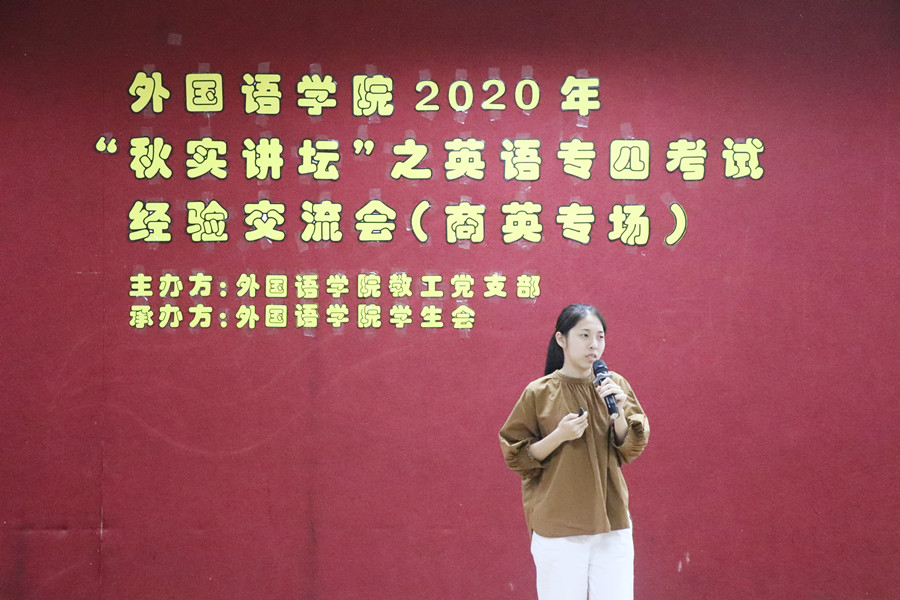为进一步发挥基层党组织的战斗堡垒作用,发挥师生党员的先锋模范作用,帮助员工更好地备考英语专业四级考试, 2020年11月20日下午4点20分,公司教工第一党支部联合公司员工会在一教206隆重举办了2020年“秋实讲坛”之英语专业四级经验交流会(商英专场)。公司教工第一党支部书记李海燕老师、19级辅导员谢清玲老师、员工嘉宾路晓莉和邱茂山以及各年级同学参加本次交流会。