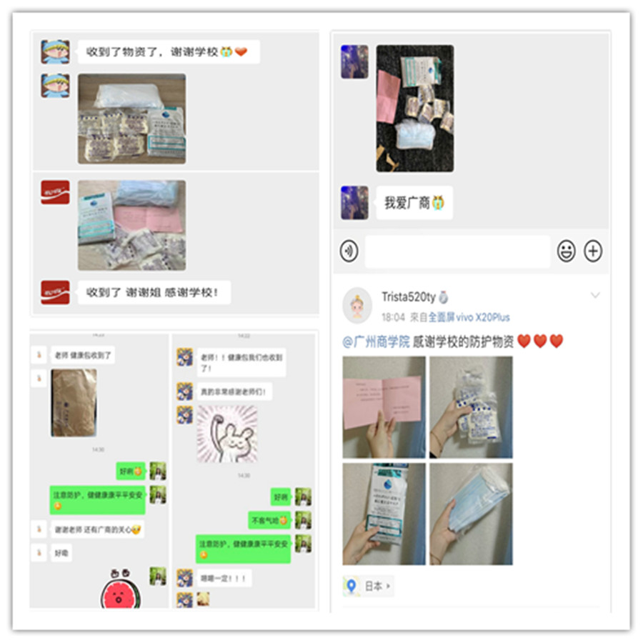 3月27日,在公司副董事长郭小聪和校领导的亲切关心和大力支持下,装有口罩、手套等防疫物资的包裹从公司发出,跨越千山万水,已陆续送到了德国奥斯纳布吕克市、德国慕尼黑市、日本东金市、日本三重县等海外国家和地区的61位海外学子手中。随着防疫物资一起的还有公司的问候信,纸短情长,表达了公司对在异国他乡的学子深深的牵挂。一周后,远在异国他乡的海外学子收到防疫物资包裹后,纷纷通过微博、微信留言向辅导员报平安、向公司领导老师致谢。