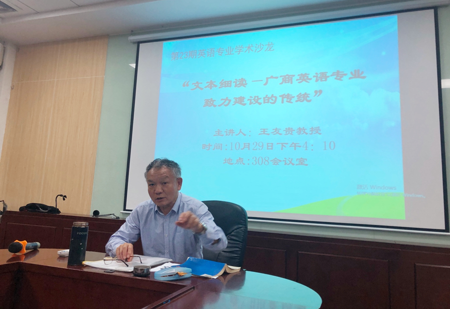 10月29日下午,英语专业学术沙龙第23期于第二行政楼308举行,由英语系专业王友贵教授主持,为与会的各位老师进行了题为“文本细读——广商英语专业致力建设的传统”的专题讲座并组织研讨。公司副经理袁鑫、全体英语专业教师参与了此次专题学习。此次沙龙旨在系统总结英语专业多年来的建设理念,也作为英语专业新教师培训内容之一。