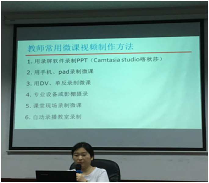 在本次活动中,赖老师介绍了微课制作的要点和方法,并根据自己制作微课的经验,讲解如何通过通过录屏、DV、课堂现场等不同微课软件来制作微课视频。赖老师认为,微课之“微”在于四个要点:简洁、精炼、透彻和深刻;而微课之“简”则通过界面、用图、讲解、文字来体现;在制作微课过程中,须涵盖五个步骤:分析、设计、制作、应用和评价,并要把握好微课设计的度。微课虽然在前期制作中需要花费不少的时间,但是微课设计可以帮助教师提炼教学难点和重点,思考如何结合教育学和二语习得理论,设计教学环节,让员工易于理解,提高教学的有效性,也符合目前“互联网+”教育模式的发展趋势。合理使用微课资源,一方面可以提高教学效率,另一方面也可以促进教师的科研。活动最后,赖老师给大家演示了如何用喀秋莎、Prezi、Powtoon和手绘纸片教师常来制作微课。
