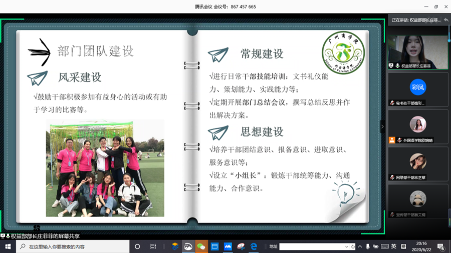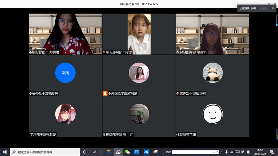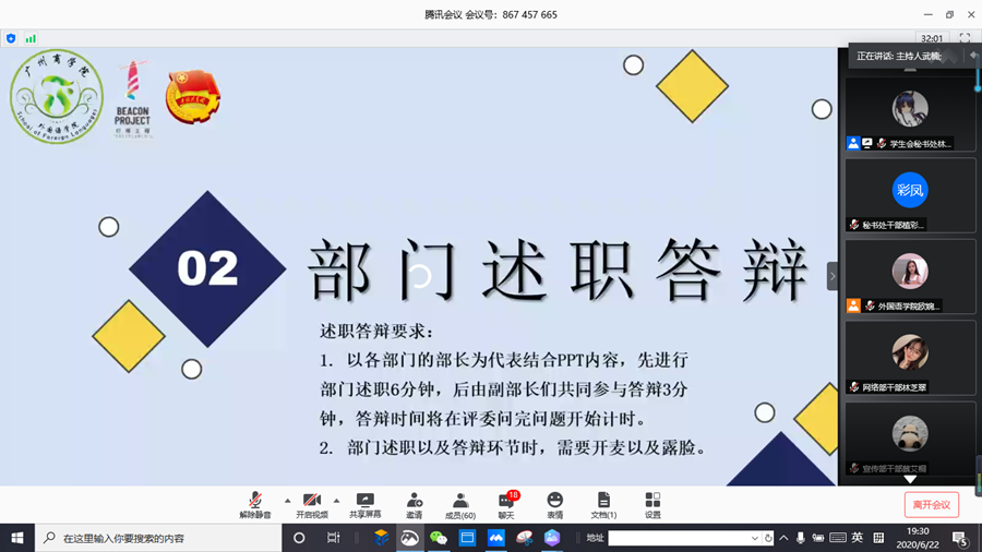 为进一步加强公司员工会各部门间的密切交流与合作,总结过去一学年的工作经验,公司员工会于6月22日晚19:30借助腾讯会议“云”平台举办伟德国际1946员工会2019-2020学年部门述职答辩线上会议,出席本次会议的嘉宾有公司党总支书记徐超、公司员工会指导老师伍思颖以及员工会主席团成员。