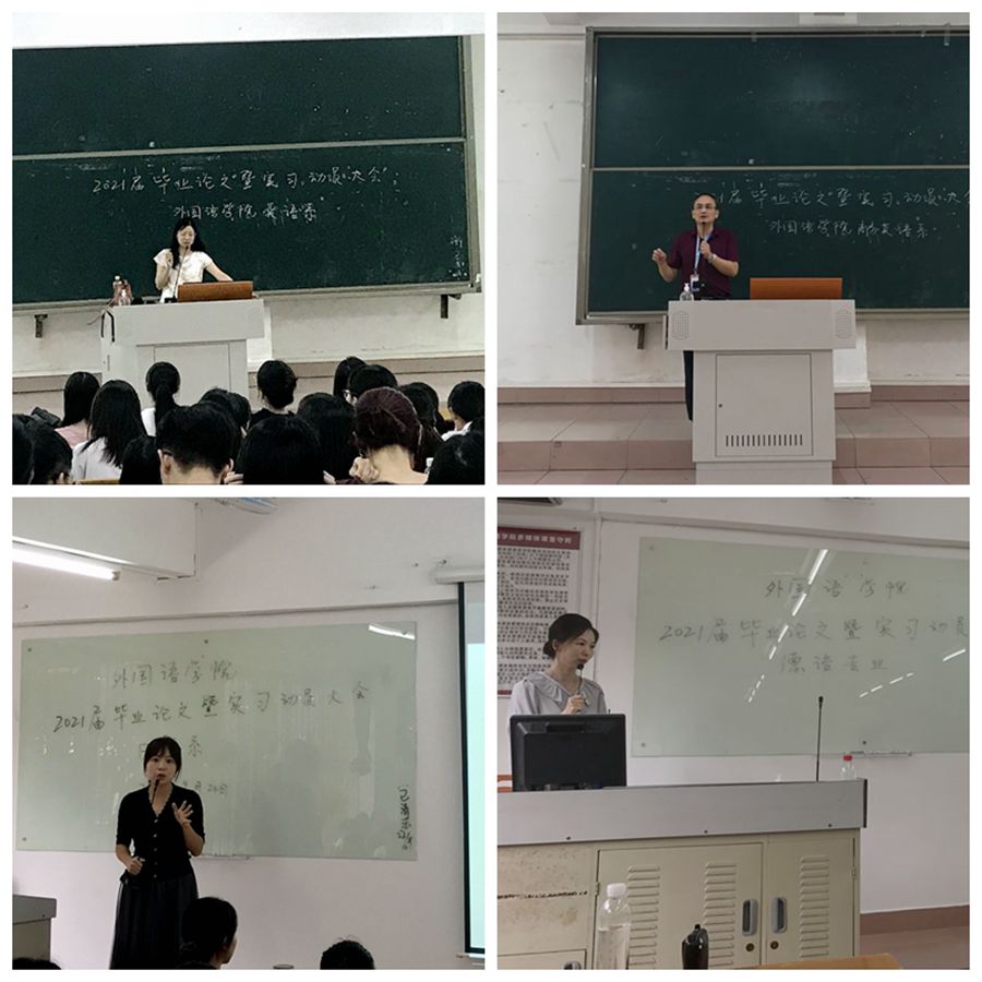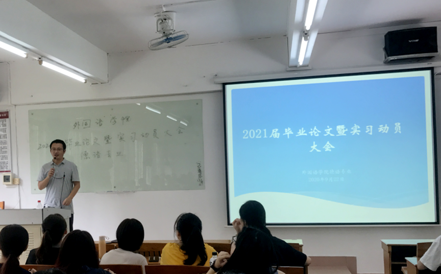 9月22日-9月24日,公司先后组织了德语、商务英语、日语、英语四个专业毕业生召开了四场“2021届毕业论文暨实习动员大会”,公司副经理袁鑫、德语专业系主任周昳旸、商务英语系主任李望华、日语专业系主任杨烨、专业带头人李晶教授、英语系主任程瑜瑜以及辅导员黄士库、刘丽参加会议。会议由各系主任主持。