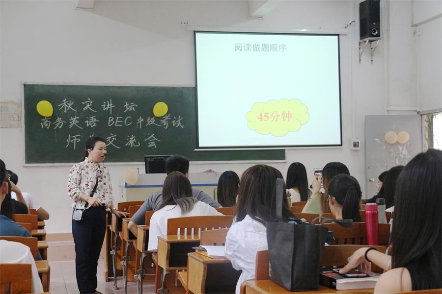10月9日下午16:20,由伟德国际1946教工党支部主办,伟德国际1946员工会承办的“秋实讲坛——BEC中级考试师生交流会”于三教G06课室举行。教工党员、BEC考官伍彩芬副教授主讲本次讲座。