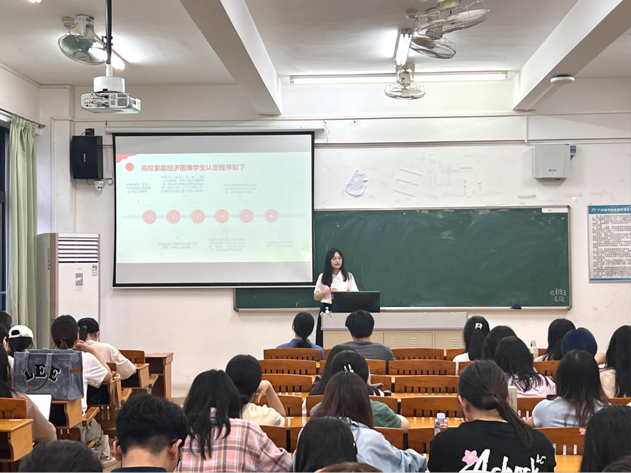 宣讲会上,王慧敏通过简洁明了的流程图,分别从“偿、免、奖、助、贷、勤、补”七位一体的员工资助政策体系进行宣讲,并详细地介绍了国家以及校内相关资助政策,涵盖了国家奖学金、国家励志奖学金、《广东省家庭经济困难员工认定办法》政策、生源地信用助学贷款以及老员工入伍及退伍资助政策内容。随后,她着重向同学们讲解了家庭经济困难认定的申请流程、材料准备及要求、注意事项等。