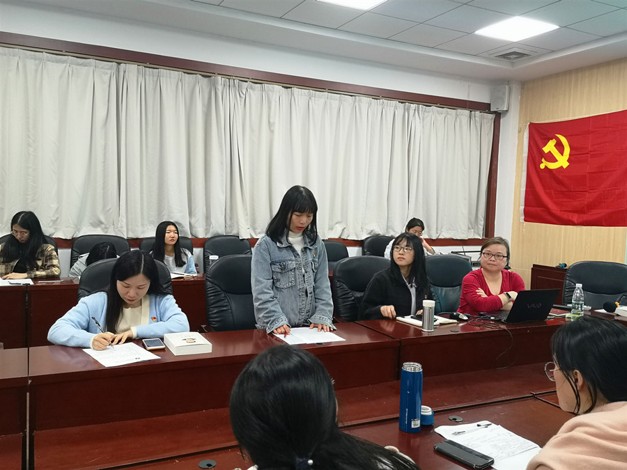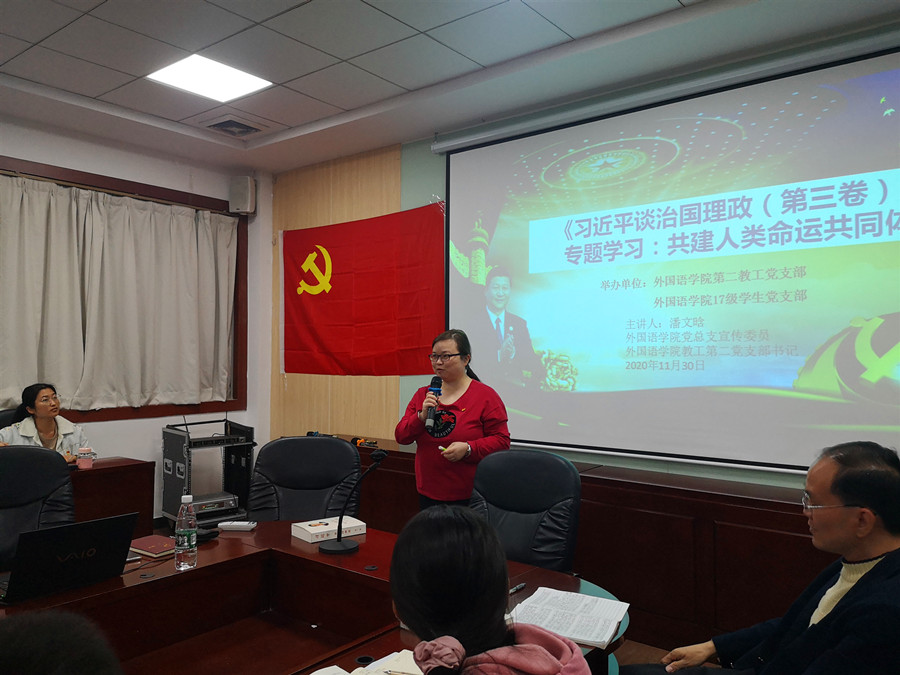 潘文晗声情并茂的讲述深深地打动了每一位在座党员的内心,引起大家热烈讨论。教工党支部的范俊英、薛俊洁分别结合具体事例讲述了自身对人类命运共同体的认识和体会,同时也对外语专业的党员同志们寄予厚望,希望员工党员同志们在构建人类命运共同体的大环境下能有一番作为。随后,两名员工党员也分享了自己参与本次党课学习的心得体会。