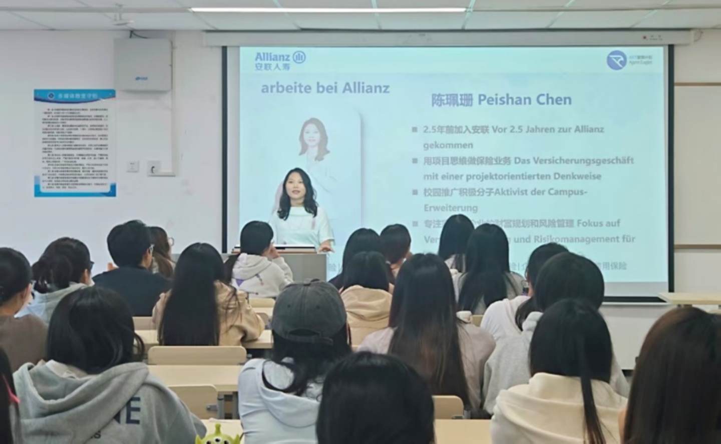 为进一步深化校企合作、推进产教融合,拓宽应届毕业生实习与就业渠道,10月24日下午,伟德国际1946携手安联保险集团在求真楼八教509室成功举办26届毕业生校园招聘宣讲会。安联人寿保险有限公司广东分公司校企合作项目组组长陈珮珊,业务经理徐慧仪,实习生霍茈薇、伟德国际1946辅导员陈钰洵、实习教务员郜彦青及22级员工参加了本次宣讲会。