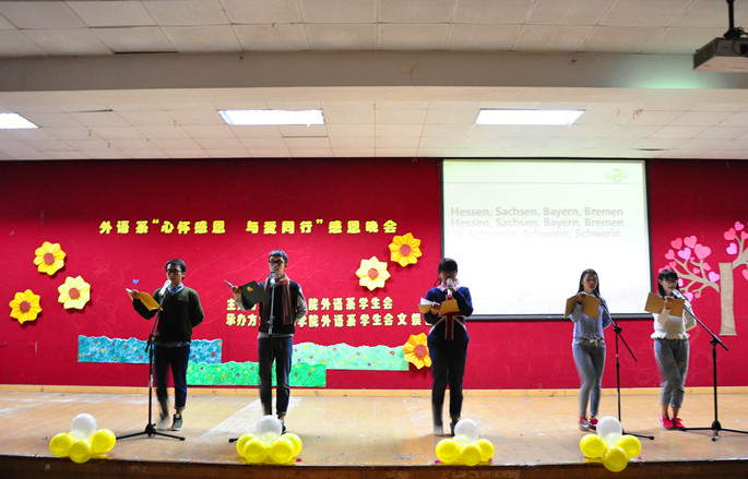 12月5日19:00,为庆祝广州商学建校15周年,外语系员工会在A206成功举办了“心怀感恩,与爱同行”感恩节晚会。出席本次晚会的嘉宾外语系党总支书记徐超,辅导员刘万里、黄玉亭、外语系14级员工导师张淑华老师、赖宝滢老师、法律系辅导员祝建波、国际公司辅导员郑珺予、外语系14级学长和其他兄弟院系员工干部代表。
