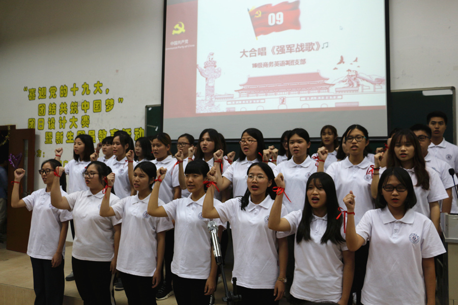 “我们是五月的花海,用青春拥抱时代;我们是初升的太阳,用生命点燃未来…”嘹亮的歌声为本次活动拉开了帷幕,合唱共青团团歌《光荣啊,中国共青团》使得观众们内心的自豪感、民族感油然而生,也让观众们对接下来的节目更加期待。“一玉口中国,一瓦顶成家,家是最小国,国是千万家。”17级商务英语1班、2班带来的手语表演《国家》为我们述说了国与家的命运交织,“有了强的国,才有富的家”她们用无声的语言默默讲述繁华世界的变迁,用丰富的肢体娓娓道来祖国强盛的自豪。决胜全面小康社会建设进入了新时期,发展中国特色社会主义走进了新时代,这一切都离不开我们伟大的党的领导,来自17级英语2班的诗歌朗诵《青春喜迎十九大,不忘初心跟党走》,向我们指明了在砥砺奋进新时代中青年老员工的责任和义务,“不忘初心”是新时代青年必须牢记的使命。16级商务英语9班余栩同学带来的双截棍表演《棍舞风生》震撼全场,干脆利落的甩棍爆气球将全场的气氛推向了高潮,赢得了台下观众的阵阵喝彩声。他将中国传统武术文化和现代化的艺术表演形式相结合,这既是一场精彩的演出,也是一次勇敢的尝试。整场活动紧扣“喜迎党的十九大,团结共筑中国梦”这一主题,以同学们喜闻乐见的形式生动诠释、解读核心价值观的内涵和精髓,充分表达了迎接党的十九大胜利召开的喜悦心情。欢乐的时光总是短暂,16级商务英语3班用激扬高昂的大合唱《强军战歌》为今晚的表演画上了圆满的句号。