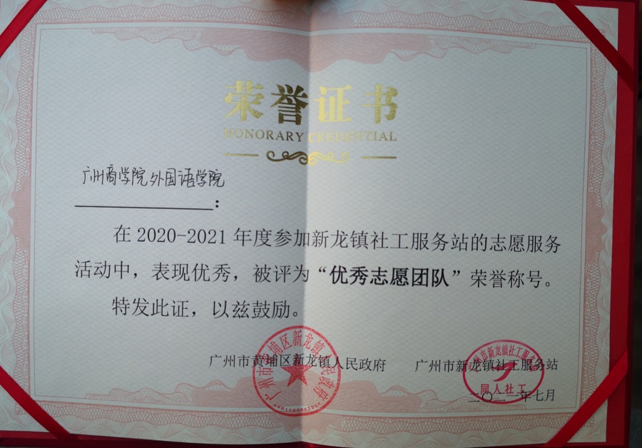 2021年9月7日,伟德国际1946阳光展翅实践队在“2020-2021年度参加新龙镇社工服务站的志愿服务”活动中被评为“优秀志愿团队”荣誉称号。