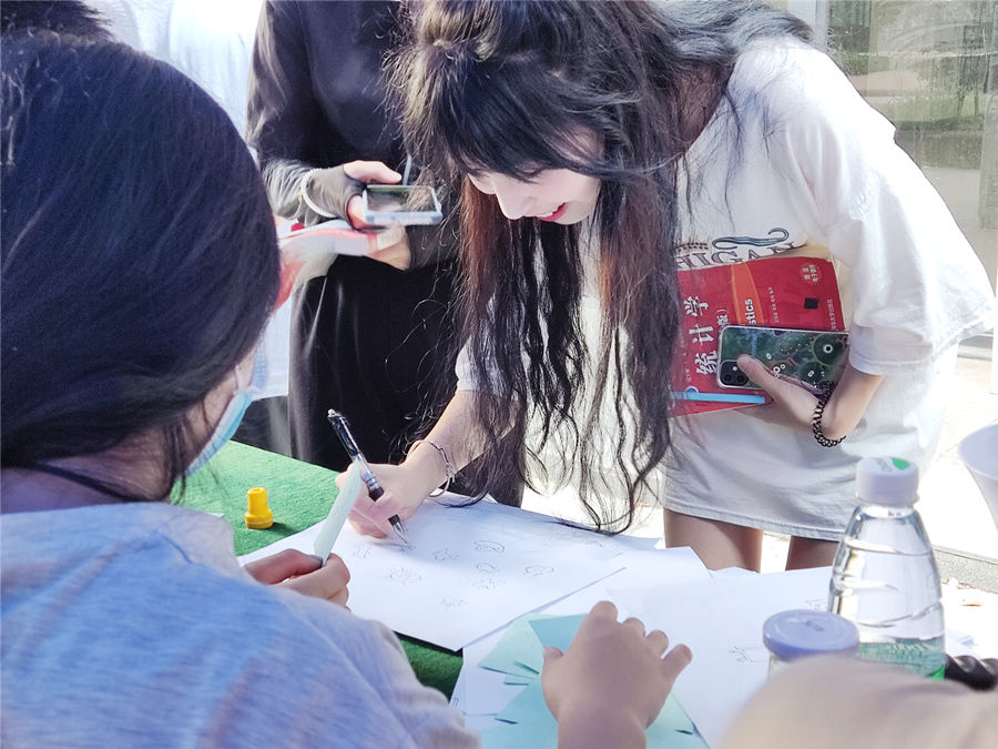 经过工作人员紧张的筹备,活动于2021年5月25日9:00准时开始。本次系列活动主要有四项内容。一是“心理辅导站,你我心相连”,即随机抽取纸条,回答问题,题目涉及心理辅导站和心理健康的相关知识;二是天天向上手势舞,同学们跟着做出视频里的动作,视频为综艺节目《天天向上》主题曲的手势舞;三是歌曲飞花令,即随机抽取一个字,然后唱出带有这个字的五句歌词;四是画一画,参与者随机抽取一张简笔画,用15秒以内的时间看图画上的内容,然后将卡片交给工作人员,自行完成绘画。获得两个公司章便可以盖一个校集章卡上的院章,还能参与抽奖。