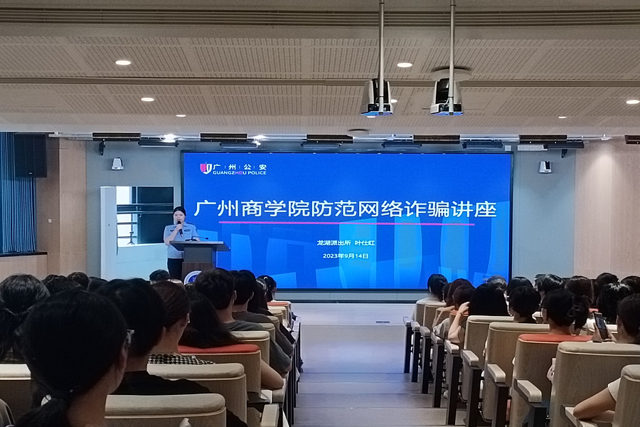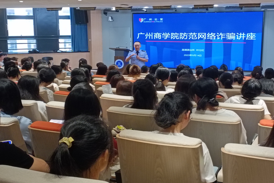 为引导2023级新生提高安全防诈骗意识,构筑新生安全开学季,公司于9月14日在第八教学楼203和204课室开展。安全第一课由黄埔区龙湖街道派出所警官叶仕红和范志宏主讲,2023级英语专业辅导员蔡柳渊、商务英语专业辅导员陈丽珊、日语德语西语专业辅导员谢清玲以及2023级新生出席本次活动。