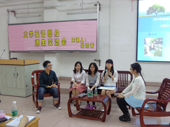 在交流会上,姚丽芳老师向全体同学介绍了现在大学英语四级考试与往年不同题型的情况,帮助同学们更加了解英语四级考试。她指出,如果想要在四级考试中取得较好的成绩,在复习中有四个要点:学会看图作文、攻克听力、拿下阅读、突破翻译。此外,她提醒同学们,在平时学习英语过程中要学会积累,特别是有关中国特色传统文化方面的词汇及句子。要学会用英语表达中国文化,多看英文报,扩大知识面。同时她还说道,在作文中多运用高级词汇能得到更好的分数。在2012年大学英语四级考试获得较高分的沈小莲同学和刘学萍同学为大家介绍了她们各自的复习要点和答题技巧。沈小莲强调,在做听力时,先看题目圈出关键字更好答题;做阅读时,先看短文,理解短文意思再作答或者也可以在题目中找关键词在回过头看短文,同时要多记单词才能提高做题速度。刘学萍认为,在复习过程中根据自我情况定目标,量力而行;合理安排复习的计划,循序渐进;从薄弱点入手,贵在坚持;单词最好是背高频词汇,重在积累;每天固定地听力与做题,熟能生巧;考试时句子简单正确好过复杂却错误,避重就轻。在现场观众提问环节,同学们都积极提问,姚丽芳、沈小莲和刘学萍都耐心地解答了同学们的问题。