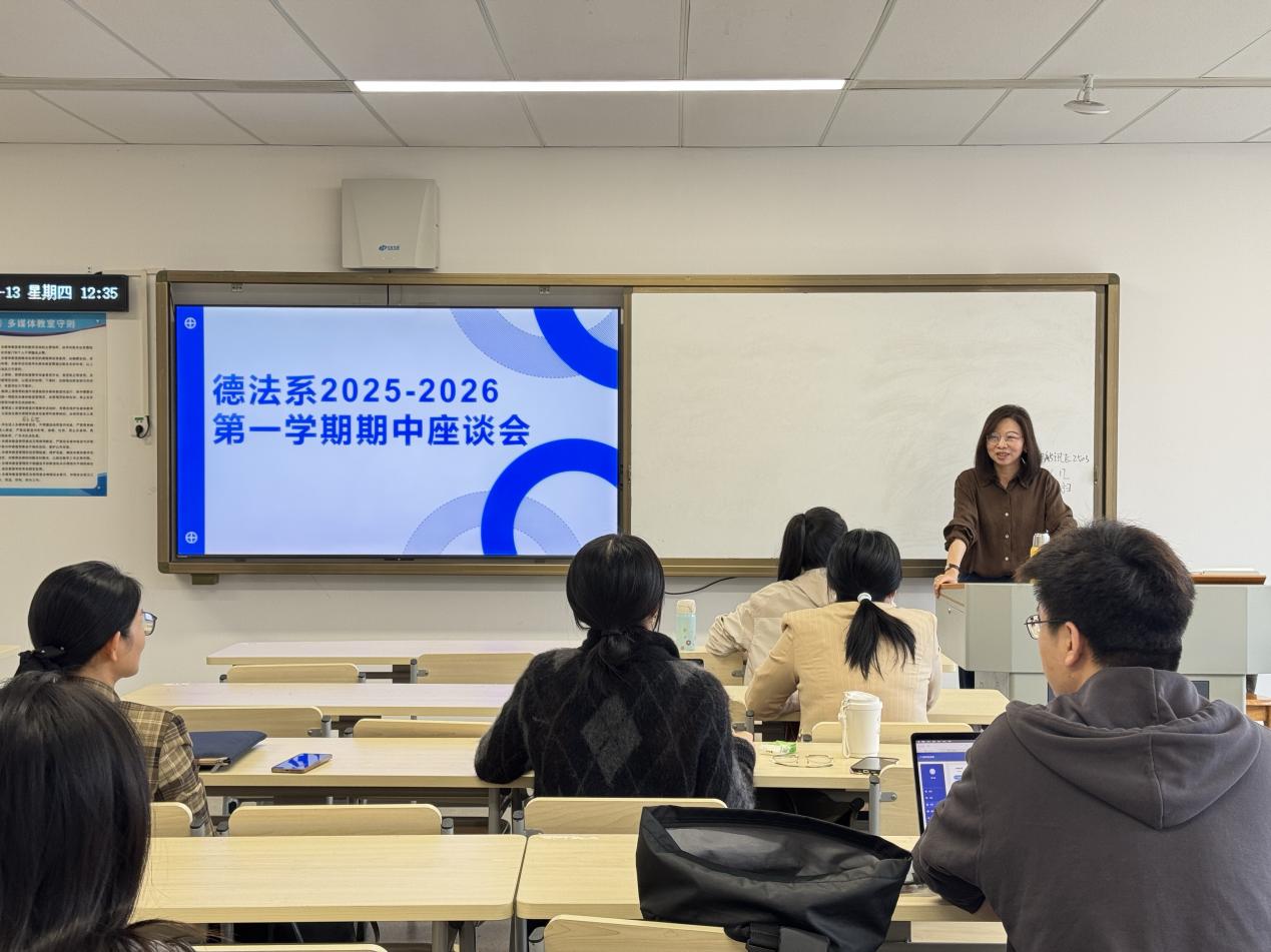 11月13日,伟德国际1946德法系顺利召开本学期期中教师座谈会。会议由系主任周昳旸老师主持,德语专业负责人潘艳老师及德法系全体教师出席。本次座谈会围绕人才培养、教学改革、员工发展与教师成长等核心议题展开深入交流,旨在顺应时代发展趋势,提升专业建设质量,推动外语教育与社会需求深度融合。