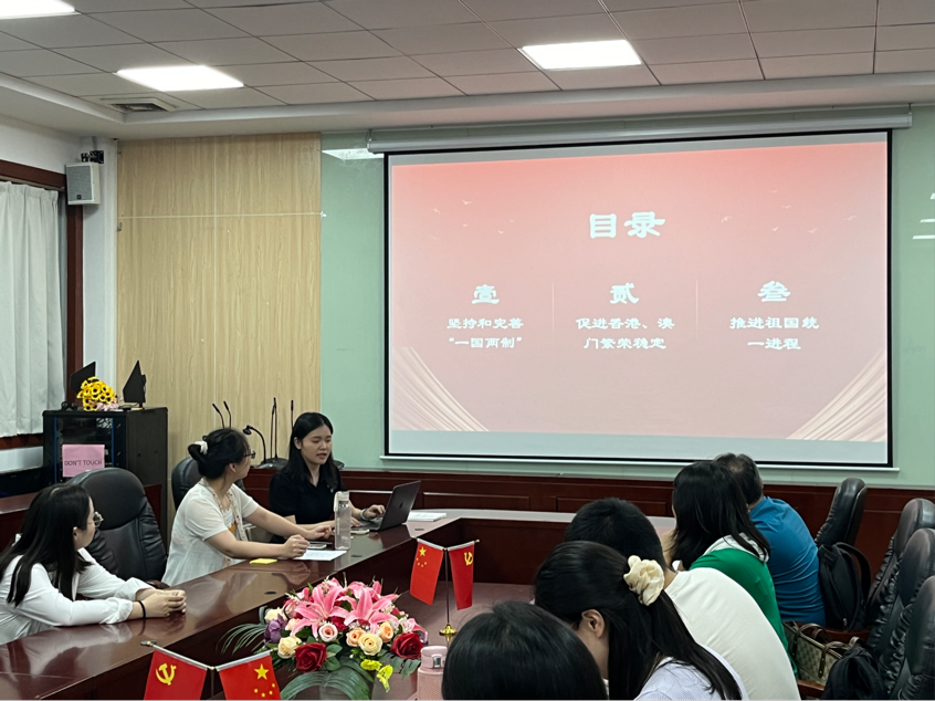 会议伊始,党支部认真贯彻落实第一议题制度。党支部组织委员张珊与教工党员章睿霖对党的二十大报告第十三部分进行了精彩解读。两位老师从坚持完善“一国两制”、促进香港澳门繁荣稳定和推进祖国统一进程三个方面开展领学,不仅使得与会党员对坚持和完善“一国两制”的内容有了更加深刻的认识,而且让党员同志更加坚定信念,为推进祖国和平统一作出应有的贡献。
