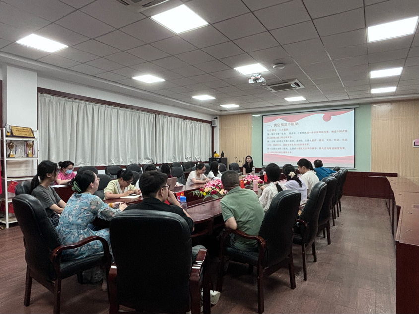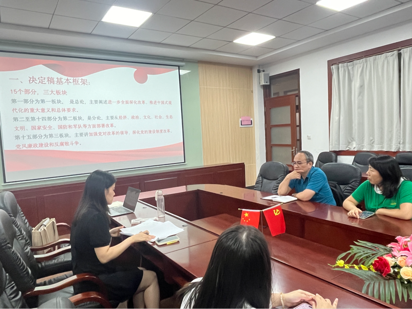 紧接着,朱渺详细介绍了党的二十届三中全会的基本情况以及会议通过的《中共中央关于进一步全面深化改革、推进中国式现代化的决定》的主要内容。朱渺从会议召开的背景意义、主要议程、核心成果三个方面进行了全面介绍,她指出,党的二十届三中全会是在我国迈上全面建设社会主义现代化国家新征程、向第二个百年奋斗目标进军的关键时刻召开的一次重要会议,为新时代新征程党和国家事业发展指明了方向。朱渺重点解读了会议提出的关于深化党和国家机构改革、加强党的全面领导、推进国家治理体系和治理能力现代化等方面的重大决策部署。她强调,这些决策部署是新时代坚持和发展中国特色社会主义的必然要求,是推进国家治理体系和治理能力现代化的重要举措。朱渺认为,作为高公司党员教师,通过学习党的二十届三中全会精神,我们应充分认识到在新时代新征程中教育改革的重要性和紧迫性,激励我们更加坚定理想信念,将立德树人作为根本任务,不断学习新的教育理论,创新教学方法,以创新开放的态度对待教育工作,在实际工作中取得更多创新成果。