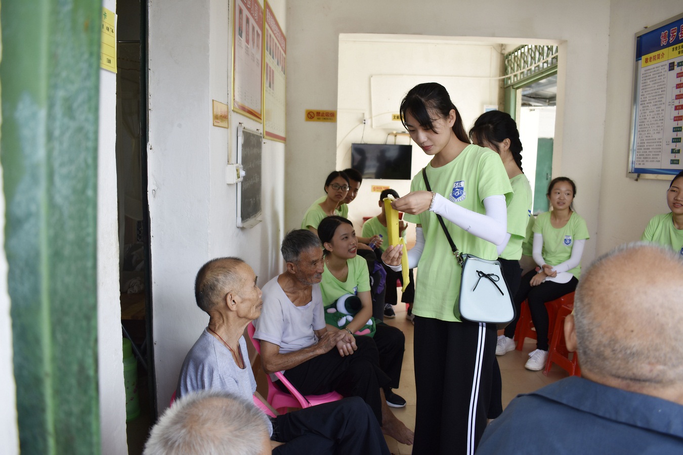行程中,志愿者们自觉有序地排成整齐的队伍,良好的精神风貌引起了村民的格外注意,这一抹抹绿色成了马路上最靓丽的风景线。到达敬老院后,志愿者们首先为老人们送上了精心准备的慰问品,将切好的水果送至每位老人的口中,他们脸上洋溢着幸福的笑容感染着每一个人。随后,志愿者们偎依在老人们的身旁,听他们讲述年轻时的经历与梦想,他们动人的故事唤醒了志愿者们对理想和信念的孜孜追求。紧接着,志愿者们还为老人准备了欢快的舞蹈和音乐,活力的舞姿和动人的歌声让原本安静的敬老院氛围热闹了起来,老人们看得全神贯注,时不时也随着音乐的旋律摆动,仿佛回到了自己的青葱岁月里。离别之际,志愿者们为老人送上暖心的拥抱,惟愿老人家身心健康,暮年时光比蜜糖还要甜!