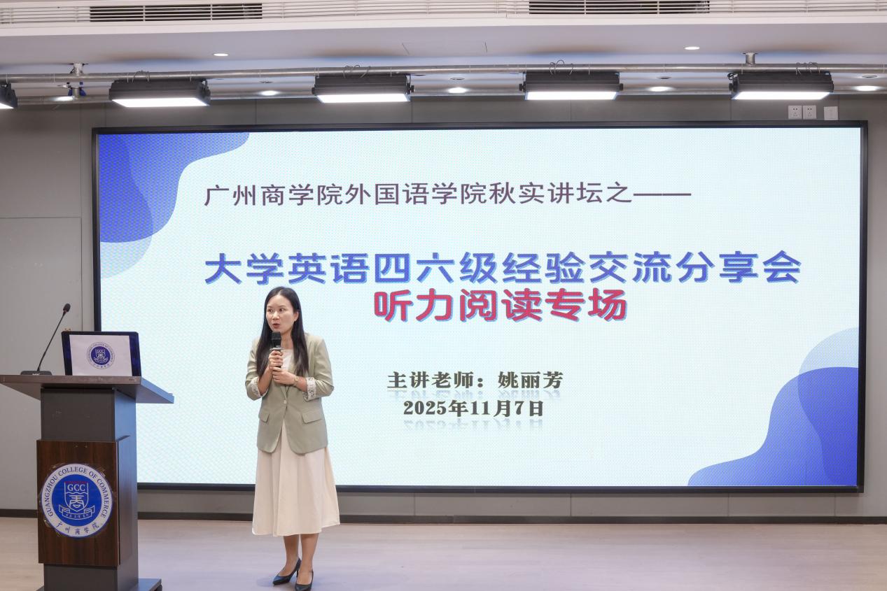 在交流会中,姚丽芳围绕四六级听力与阅读备考提供了系统而实用的建议。针对日常听力训练,她介绍了五种提升英语听力的有效方法:朗读法、听写法、精听法、倒听法和刷题法。在考试技巧方面,姚丽芳强调了“视听一致”原则,即“听到什么选什么”,并结合新闻报道、长对话及短文听力等不同题型,详细解析了出题规律与应对策略。关于阅读部分,她建议同学们养成“先审题、后读文”的习惯,并在平时训练中注重分析长难句结构,以提升理解效率。