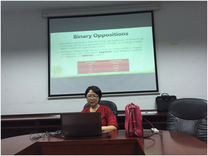 周晓丽老师介绍了解构主义重要代表人物,也是“延异”理论的提出者——法国哲学家德里达。然后,围绕着“延异”这一概念的背景知识,介绍了一系列哲学专有名词,如形而上学、逻各斯中心主义、存在等。虽然,解构主义包含很多晦涩难懂的定义和概念,但是,通过周老师清晰而富有逻辑的讲解,听众把握了 “延异”这一符号的核心内容:反逻各斯中心主义和反二元论。逻各斯中心主义也即语音中心论。法语中,difference(差异)和differance(延异)这两个词的发音是一样的,德里达认为,发音无法表达两词的差异,因而借此否定了逻各斯中心主义。二元论认为good和bad,human和animal是对立的,而“延异”的思想认为它们不是对立的,而是相容的。通过这些简单的例证,周老师让听众恍然大悟。